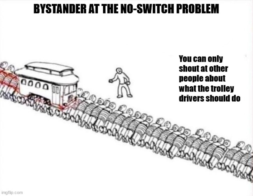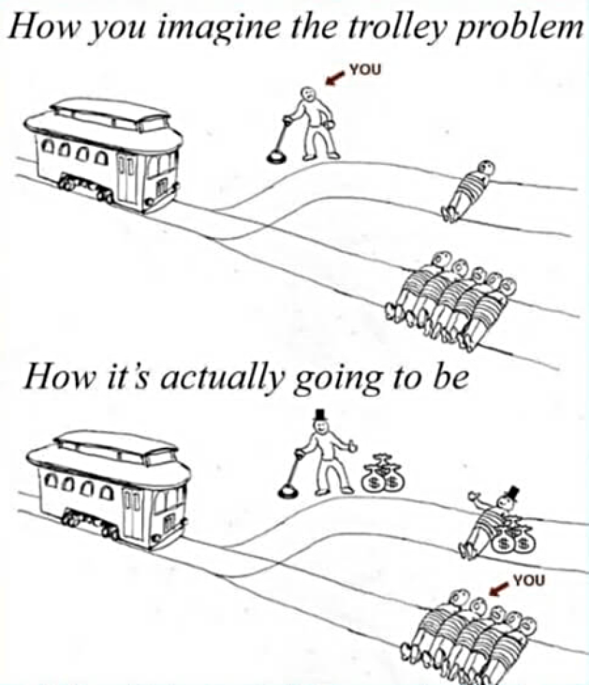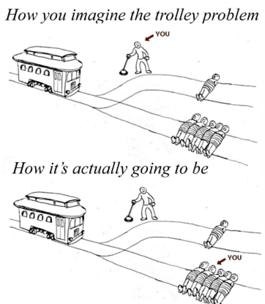 Scenario: You’re not the one pulling the lever. You’re part of the group of five people lying on the tracks hoping the person makes a decision that doesn’t kill you. There’s no decision for you to make. You may have hope, though.