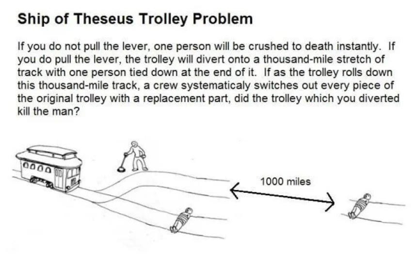 Scenario: If you do not pull the lever, one person will be crushed to death instantly. If you do pull the lever, the trolley will divert into a thousand-mile stretch of track with one person tied down at the end of it. If as the trolley rolls down this thousand-mile track, a crew systemically switches out every piece of the original trolley with a replacement part. Did the trolley that you diverted kill the man?