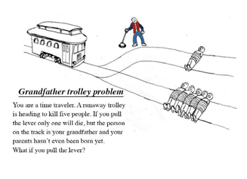 Scenario: You are a time traveller. A runaway trolley is heading to kill five people. If you pull the lever only one will die but the person on the other track is your grandfather and your parents haven’t even been born yet. What happens if you pull the lever?