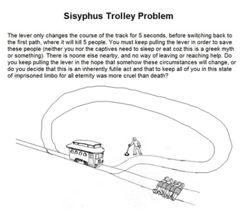 Scenario: The lever only changes the course of the track for 5 seconds before switching back to the first path, where it will kill five people. You must keep pulling the lever in order to save these people (neither you nor the captives need to sleep or eat because this is a Greek myth or something). There is no one else nearby, and no way of leaving or reaching help. Do you keep pulling the lever in the hope that somehow these circumstances will change, or do you decide that this is an inherently futile act and that to keep all of you in this state of imprisoned limbo for all eternity was more cruel than death?