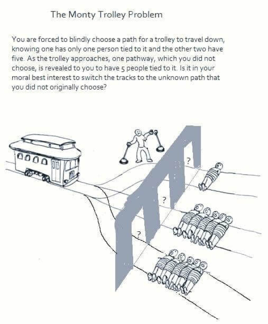 Scenario: You are forced to blindly choose a path for a trolley to travel down, knowing one has only one person tied to it and the other two have five. As the trolley approaches, one pathway, which you did not choose, is revealed to you to have five people tied to it. Is it in your moral best interest to switch tracks to the unknown path that you did not originally choose?